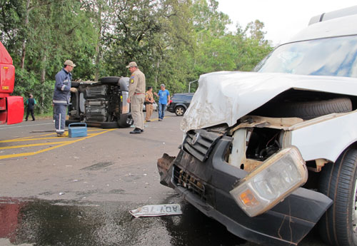 Uma colisão seguida de capotamento foi registrada pelo Corpo de Bombeiros durante a tarde desta sexta-feira (4) no cruzamento da avenida Castelo Branco com a rua Foz do Iguaçu, na zona oeste de Londrina. Segundo informações da Polícia Militar (PM), o motorista de uma Fiorino descia pela avenida com o carro quando o condutor de um Fiat Idea teria cruzado a preferencial e causado a batida.