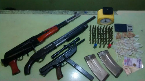Buscas foram realizadas na região pela equipe do Serviço Reservado e em uma casa no Conjunto Semíramis localizaram o suspeito, de 24 anos, o qual estava acompanhado por uma outra pessoa, de 21 anos. Após busca pessoal, os policiais encontraram com os dois rapazes 144 porções de crack, que totalizaram 160 gramas, R$ 225,00 em dinheiro e uma submetralhadora com adaptações caseiras. Ao ser questionado, o suspeito de efetuar os disparos informou que a arma usada por ele estava em uma outra casa. Os policiais foram até o local indicado, no Conjunto Heimtal, onde localizaram um fuzil AK 47, calibre 762, uma espingarda calibre 12, 65 cartuchos de fuzil calibre 762, dois cartuchos de calibre 12 e mais dois carregadores de fuzil. Um jovem, de 21 anos, estava na casa no momento da abordagem. Os três rapazes foram conduzidos, juntamente com as armas de fogo, as munições, a droga e o dinheiro, à delegacia para que as medidas cabíveis fossem tomadas. bonde.com