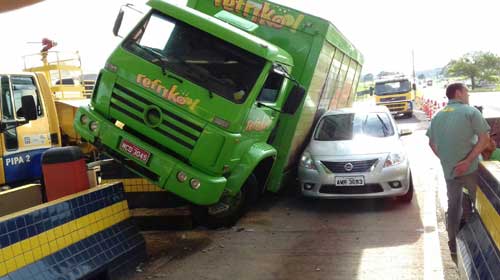 De acordo com a Polícia Rodoviária Federal (PRF), o motorista do veículo de carga alegou ter perdido o freio momentaneamente. Na tentativa de evitar colidir no veículo que trafegava à sua frente, o condutor desviu para o lado e acabou subindo na mureta que separa as cabines de cobrança. Mesmo assim, o caminhão ainda tombou e atingiu um carro de passeio. Apesar dos transtornos, não houve registro de feridos.