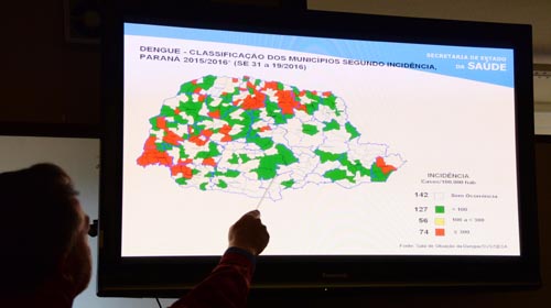 "Neste período epidemiológico, é a primeira vez que o número de municípios com mais de 300 casos de dengue por 100 mil habitantes se manteve. As notificações também estão reduzindo gradualmente", explica o coordenador da Sala de Situação da Dengue, Raul Bely. Venilton Küchler/SESAApesar do número de confirmações de novos casos estar caindo, a mobilização não pode parar. Temos que combater a dengue o ano inteiro, principalmente nas regiões endêmicas da doença", diz a superintendente de Vigilância em Saúde, Cleide Oliveira.