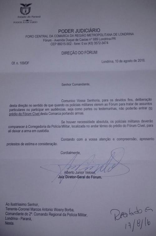 O documento pede que quando os policiais militares estiverem no "Fórum para tratar de assuntos particulares ou participar em audiências, seja como partes ou testemunhas, não poderão entrar no prédio portando armas". O documento, datado de 10 de agosto, foi recebido pelo Comando na última quarta-feira (17).