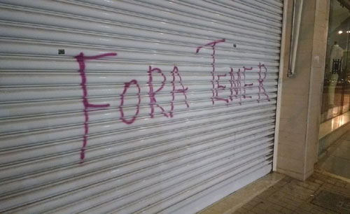 Até postes receberam frases de protesto. Em um deles, também foi afixado um papel com a frase "ninguém é palhaço não, retirada de direitos não é modernização". Abaixo, a palavra "golpe".