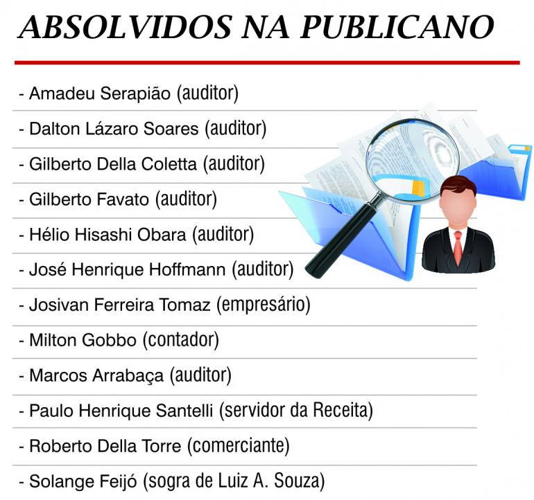 Doze dos 73 acusados de praticar delitos no processo da Publicano 1 foram absolvidos pelo juiz Juliano Nanuncio. Na parte parte dos casos, entendeu não haver provas contra os réus. Sete deles são auditores: Amadeu Serapião, Dalton Lázaro Soares, Gilberto Favato, Gilberto Della Coletta, José Henrique Hoffmann, Marcos Arrabaça e Hélio Obara, sendo que os cinco últimos foram acusados de se beneficiarem do esquema como membros da alta cúpula. "Não se pode concluir, cabalmente, que os acusados (Favato, Hoffmann, Arrabaça, Coletta e Obara integrassem a organização criminosa narrada na inicial, devendo ser, por isso, todos eles absolvidos, ante a insuficiência de provas, consagrando-se o princípio in dubio pro reo", escreveu o juiz.