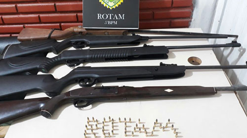 No estabelecimento, a polícia não encontrou nada ilegal com nenhum dos clientes. Porém, ao verificar os veículos estacionados em frente ao bar, foi encontrado embaixo do banco do passageiro do Astra um cartucho deflagrado, um intacto no painel e uma espingarda no banco traseiro. O proprietário disse que havia feito disparos há alguns dias. Ele admitiu aos PMs que guardava armas fogo em casa. Em busca na residência do suspeito, os policiais encontraram três espingardas atrás do sofá da sala e, no quarto dele, atrás da porta, uma quarta arma foi encontrada. Dentro de uma gaveta havia uma caixa com 50 munições. Sem registro de posse e sem documentação das armas, o suspeito foi encaminhado para a Central de Flagrantes.