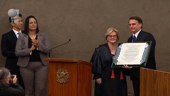 dente do TSE, ministra Rosa Weber. No documento constam nome do candidato, o partido ou a coligação pela qual concorreu e o cargo para o qual foi eleito. Bolsonaro e Mourão foram levados à sessão pelos ministros do TSE Luís Roberto Barroso e Tarcísio Vieira de Carvalho Neto. Foram saudados com aplausos pelos presentes. Em seguida, a Banda dos Fuzileiros Navais executou o Hino Nacional. Bolsonaro acompanhou o Hino com a mão no peito.