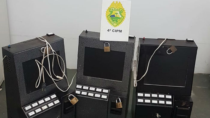 Policiais da 4ª CIPM (Companhia Independente de Polícia Militar) apreenderam, no final da manhã desta quarta-feira (11), em um bar no jardim Aquiles Stenghel (Zona Norte), três máquinas caça-níqueis.   Segundo a PM, a apreensão aconteceu após uma denúncia anônima de que no local havia exploração de jogos de azar.Divulgação/PM