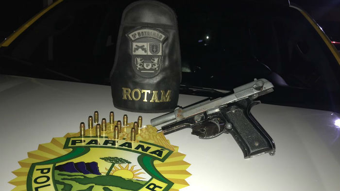 Uma pistola calibre .380 com 12 munições e R$ 228, que teriam sido furtados do estabelecimento, foram apreendidos com a vítima e encaminhados à Delegacia de Cambé.